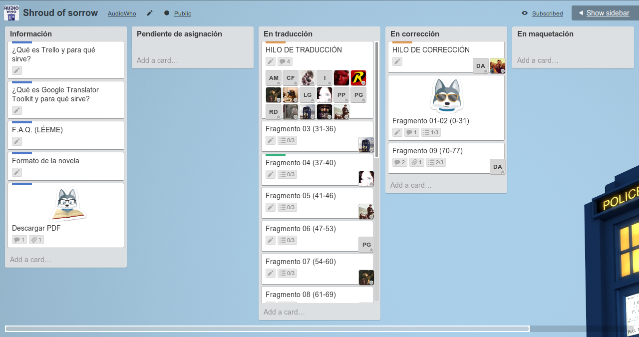 Una vez se te acepte como traductor, te invitaremos a nuestro grupo de Trello. Desde allí podrás elegir los fragmentos a que traducir. Además allí puedes comunicarte con el resto del equipo por si necesitas ayuda o tienes alguna duda. Muchas veces traducirás un fragmento conjuntamente con otro traductor.